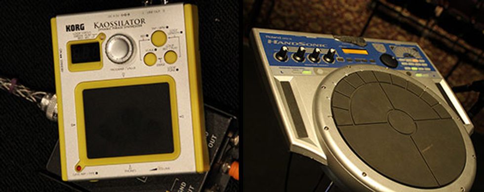 In addition, the Korg Kaossilator gives Keller access to some synth-style sounds–which are also run through the RC-300. The Roland HandSonic HPD-15 gives Keller all the drum sounds he needs to create his loops, and he also uses a Roland GR-55 for all of his synth sounds (with the Rodriguez electric).