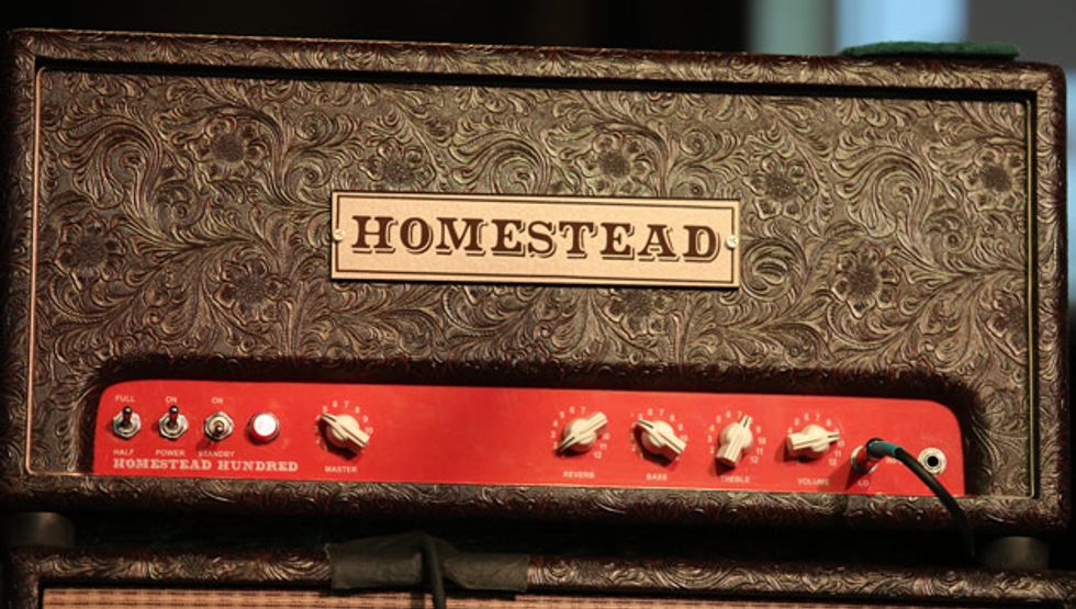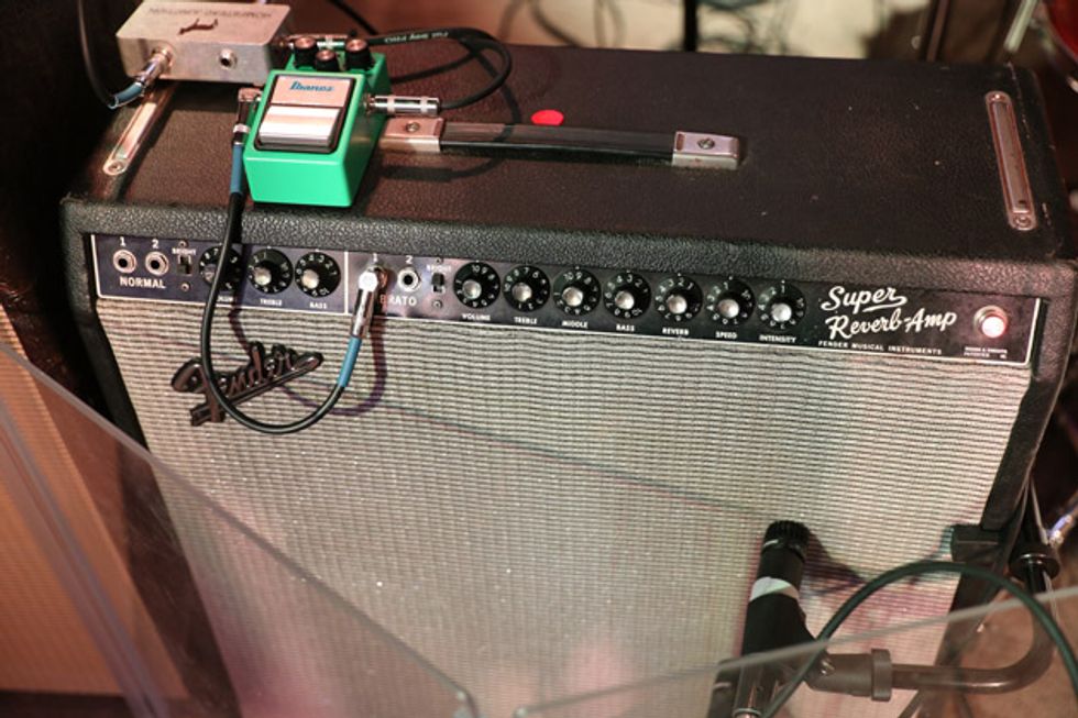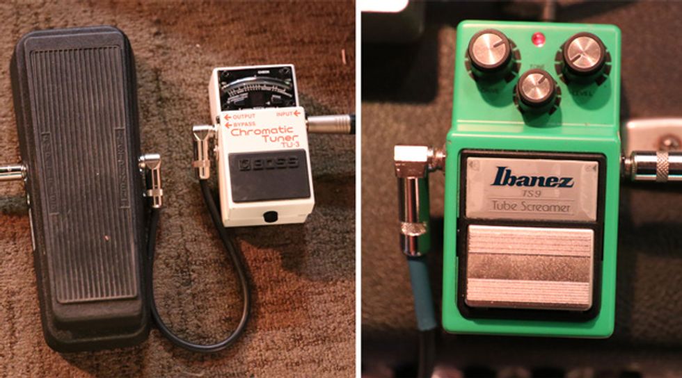 King runs into Boss TU-3 tuner and a Dunlop GCB95 Cry Baby Wah. From there a cable hits a Homestead splitter box that splits the signal to the Homestead and a reissue Ibanez TS9 Tube Screamer placed before the Super. The TS9 stays on all the time and acts like an attenuator to help bring down his volume of his cranked amps. All three pedals run on batteries.