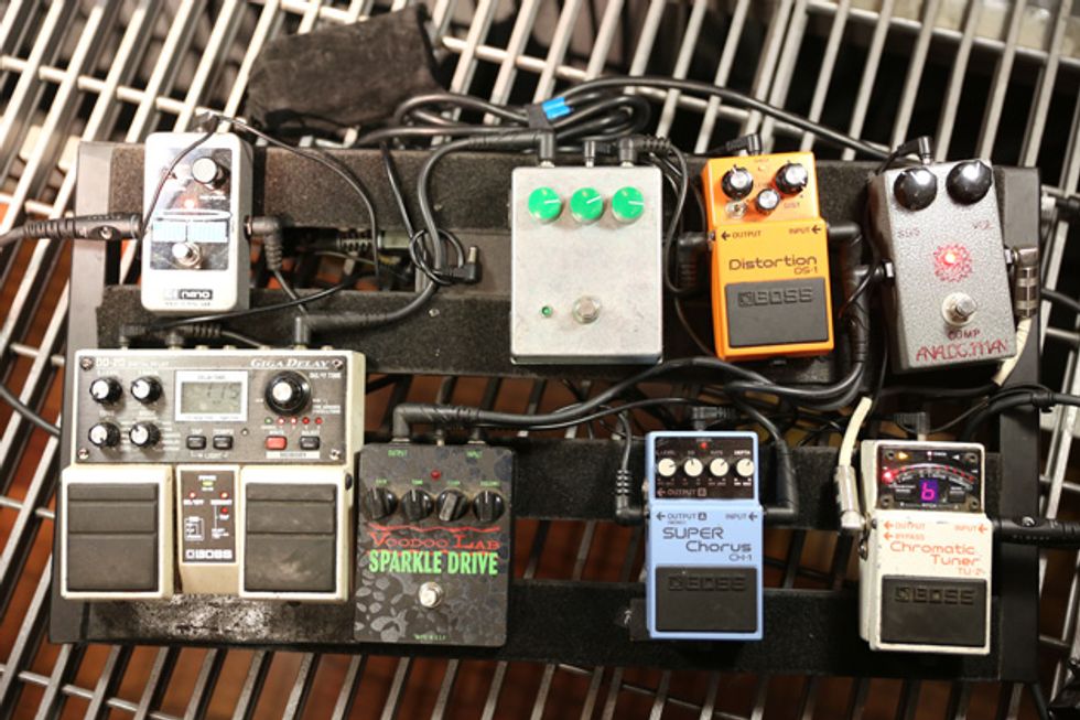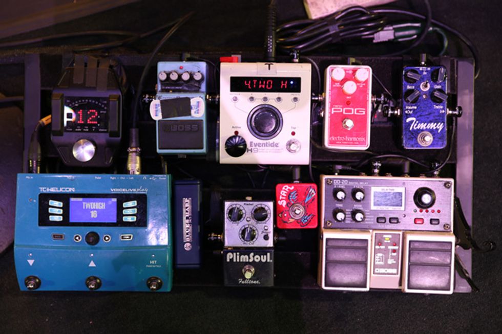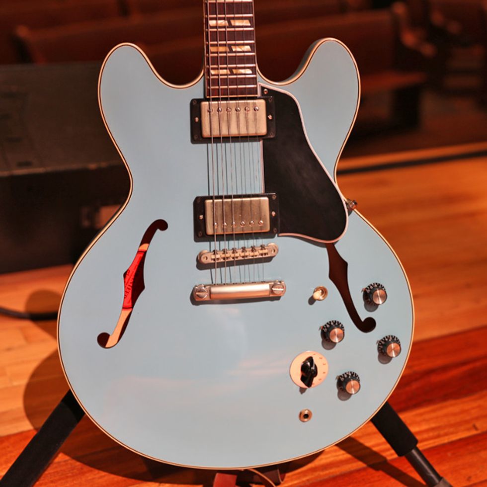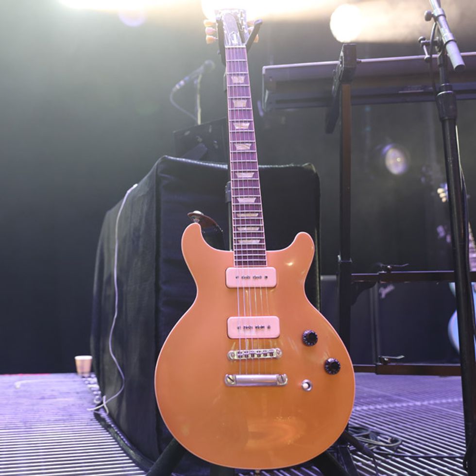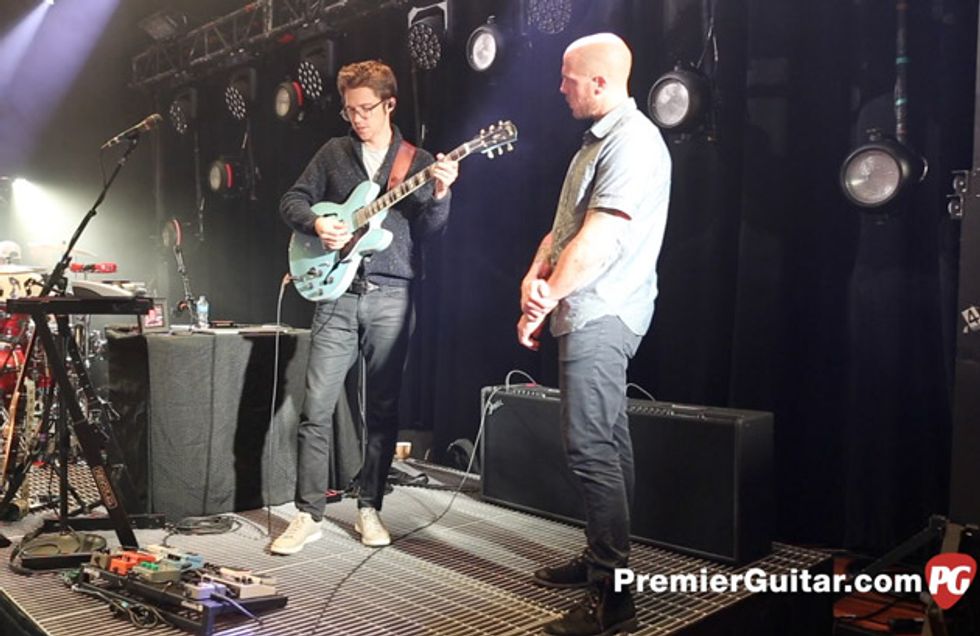 Before their first night of back-to-back sold-out shows at Nashville’s Mother Church, guitarist/singer Trevor Terndrup and guitarist/keyboardist Spencer Thomson (above left) grabbed their trusty Gibsons and demoed—much to the chagrin of the Ryman sound police—how their live rigs that embrace the old and new of guitar technology.