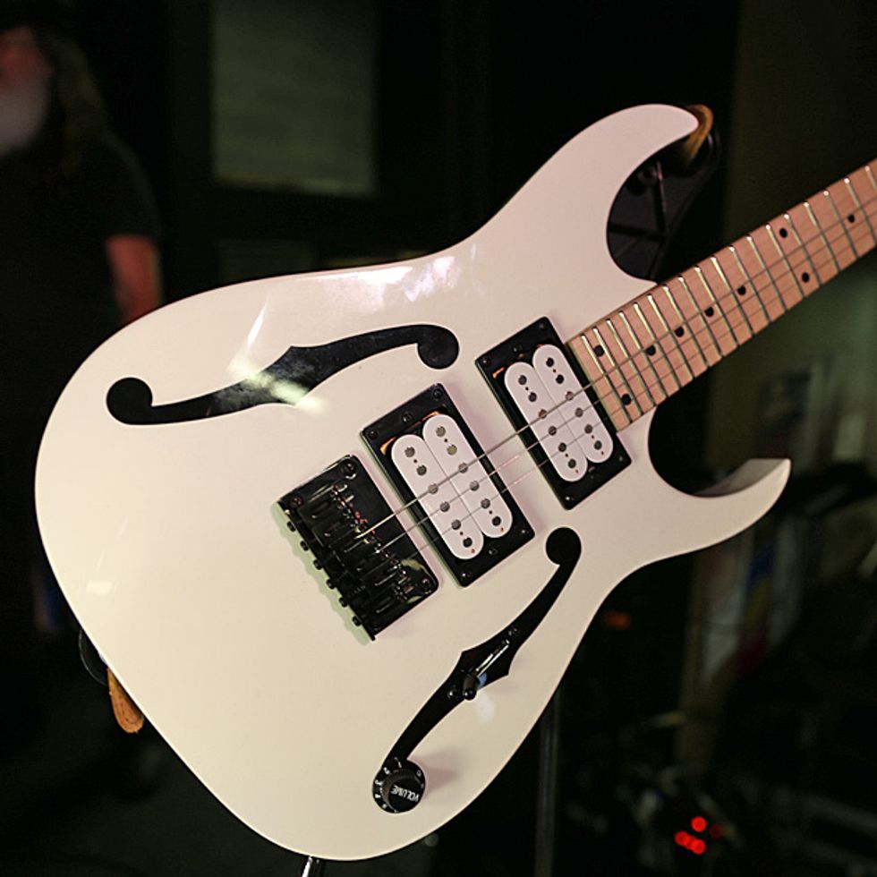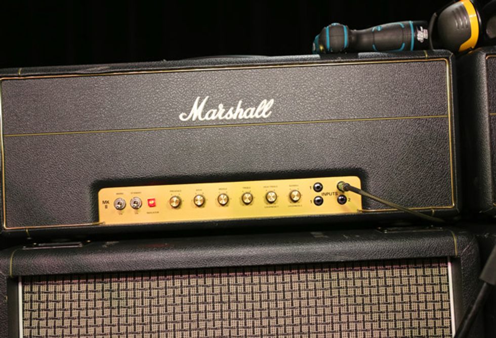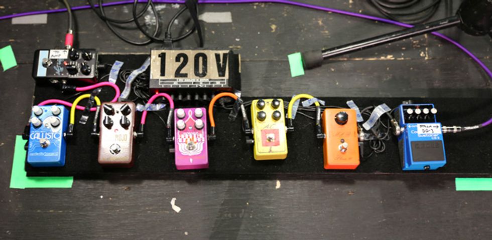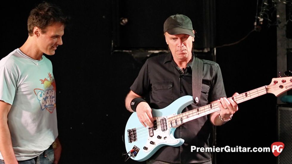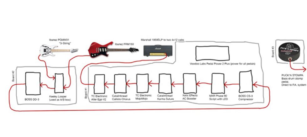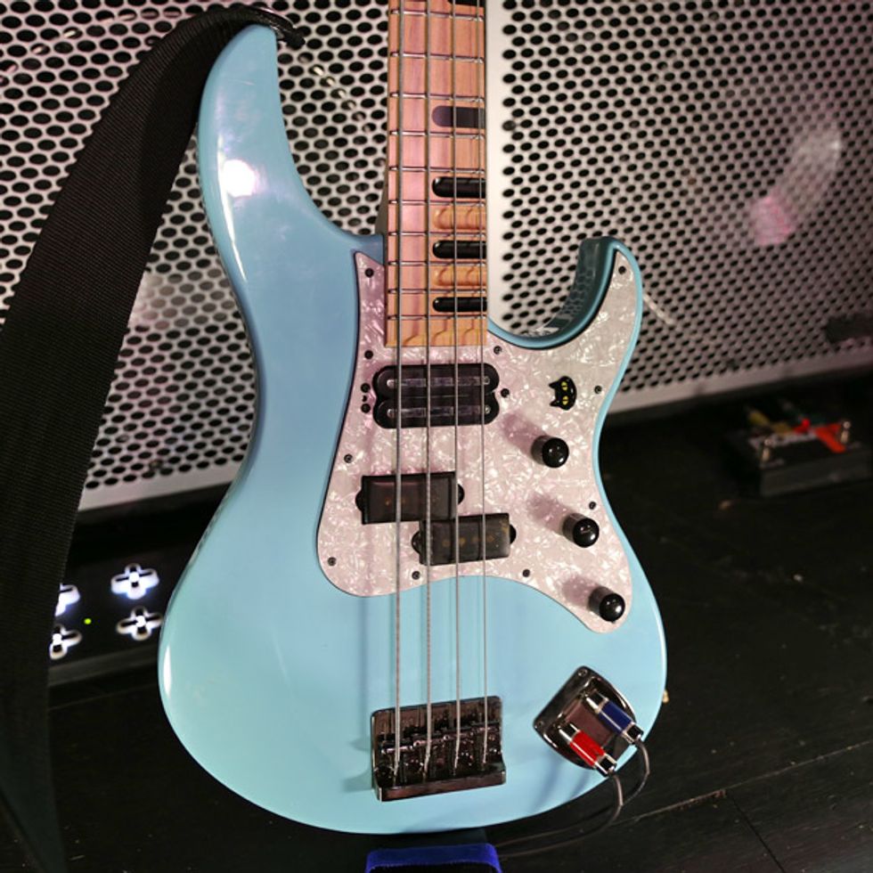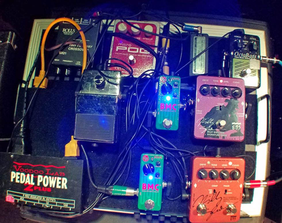 Sheehan’s signal starts with two Line 6 G75 wireless units. From there, the signal hits his signature EBS Billy Sheehan Signature Drive Deluxe. Sheehan likes them so much that he runs two of them (the other is the original version) at different settings. Both EBS pedals run into one channel of an Ashly CLX-52 Peak Compressor/Limiter that’s kept in his rack. The other channel is used on the insert of the Hartke LH1000 for the neck position pickup. After each EBS pedal, sits an EWS Japan BMC. Sheehan also uses an ISP Decimator, EBS OctaBass, and an Electro-Harmonix POG. Last in line is a Rolls SX21 Tiny Two-Way Crossover to give more overall clarity and punch. A Voodoo Lab Pedal Power 2 Plus powers the whole board, which sits on top of his amps and is rarely touched. For his foot pedals, Sheehan uses Keith McMillen 12 step which triggers sounds from an iMac running MainStage.