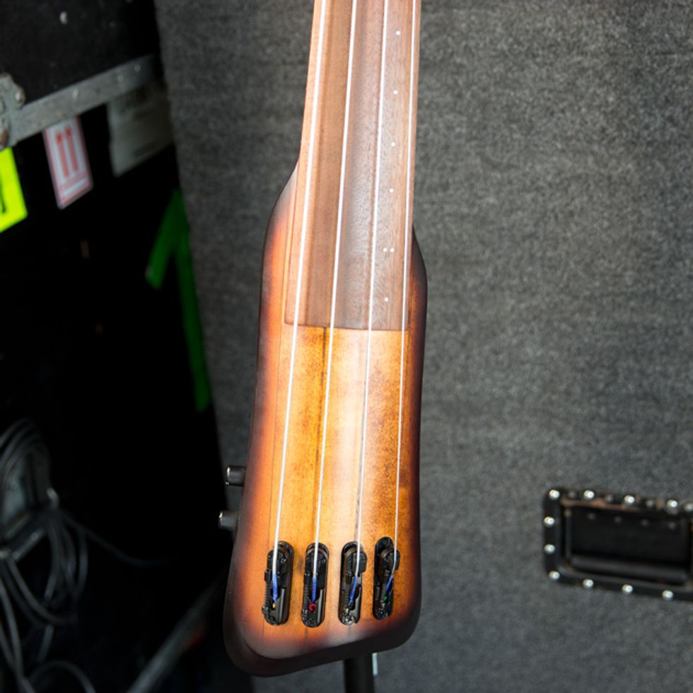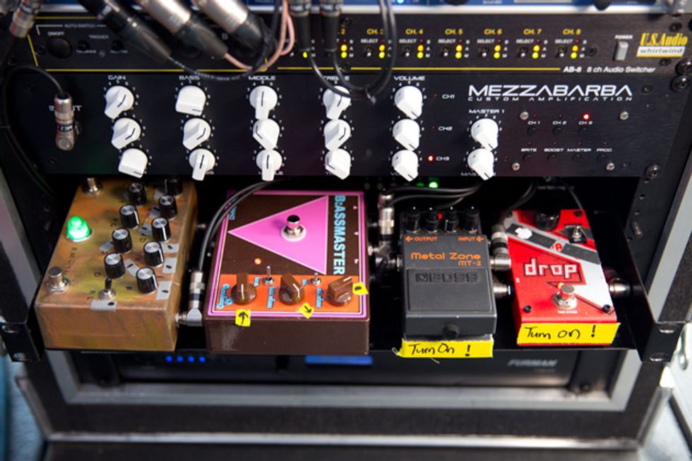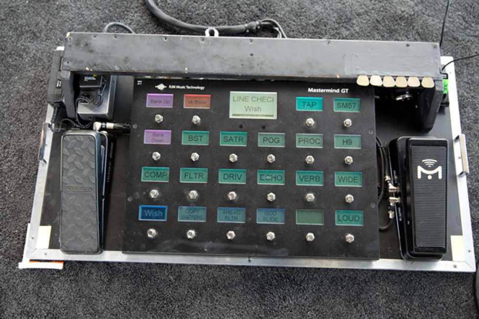 All of Alessandro Cortini’s instruments are black, including his Ibanez Talman. He strings his Ibanez guitars up with .009–.042 Ernie Ball Cobalt Super Slinky strings, and his Fenders have .010–.046 sets. Cortini uses black Dunlop Flow .88 picks.