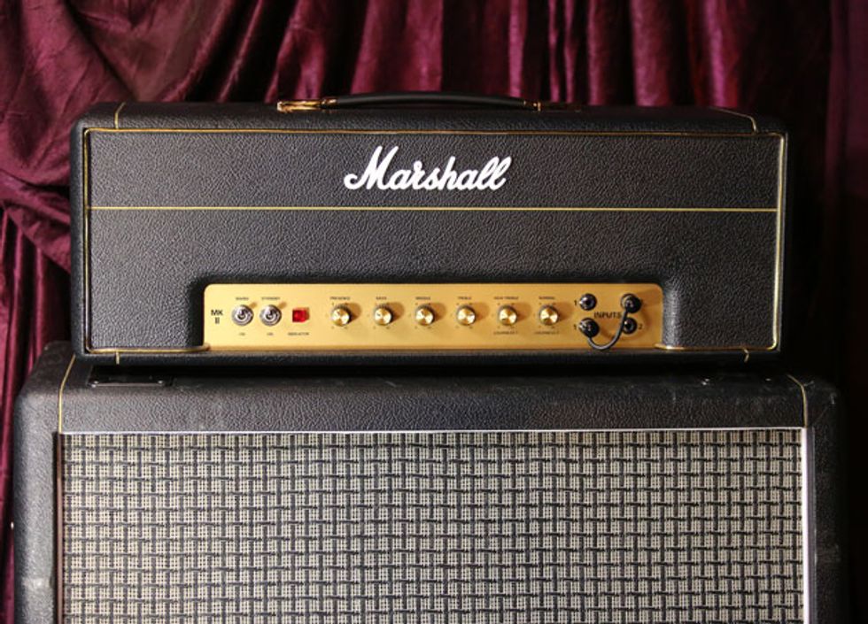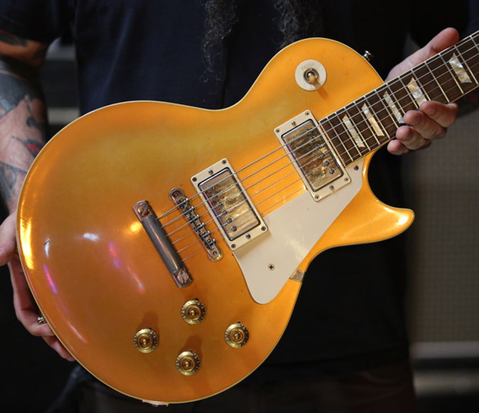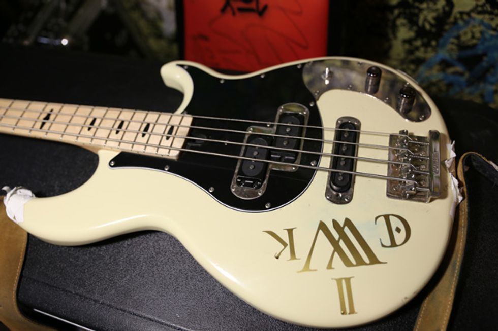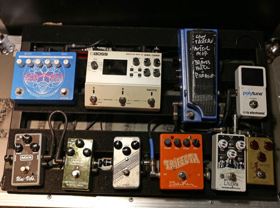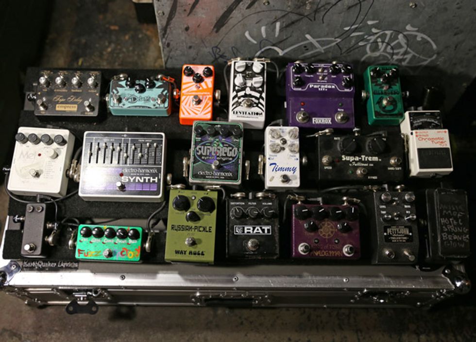 Josh is an amp guy. He has worked at Acorn Amplifiers out of Atlanta and genuinely enjoys investigating the guts of any tube amp he can get his hands on. He has his own handwired Acorn head that he’s been tweaking while off the road. Josh left it at home. For this tour, he opted for a Marshall 1987X 50-watt plexi. He removed the bright cap from the amp because it allows him to actually use the clean channel by giving him more headroom. The head powers a handwired Marshall 4x12 cabinet that has Celestion G12H 30W speakers.