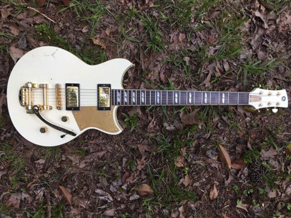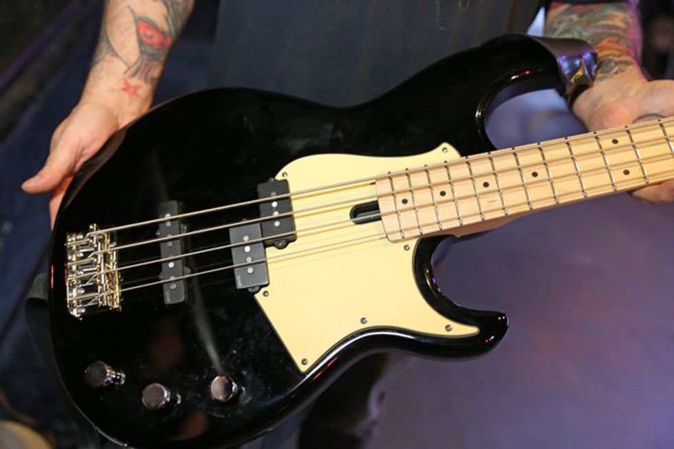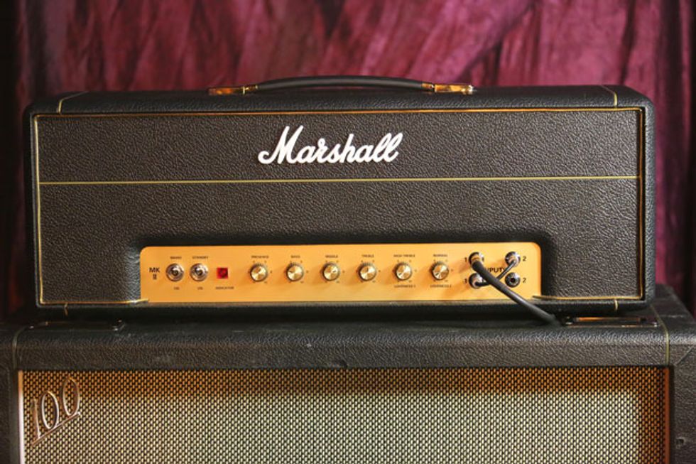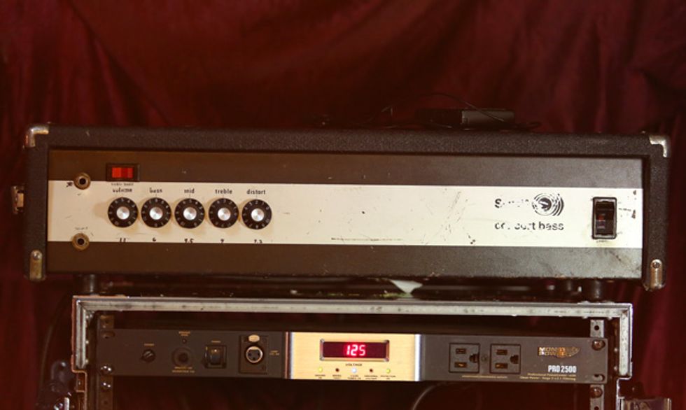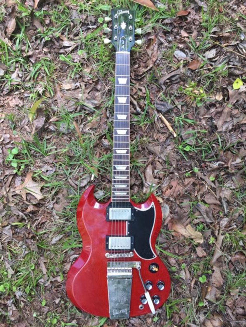 Josh is an amp guy. He has worked at Acorn Amplifiers out of Atlanta and genuinely enjoys investigating the guts of any tube amp he can get his hands on. He has his own handwired Acorn head that he’s been tweaking while off the road. Josh left it at home. For this tour, he opted for a Marshall 1987X 50-watt plexi. He removed the bright cap from the amp because it allows him to actually use the clean channel by giving him more headroom. The head powers a handwired Marshall 4x12 cabinet that has Celestion G12H 30W speakers.