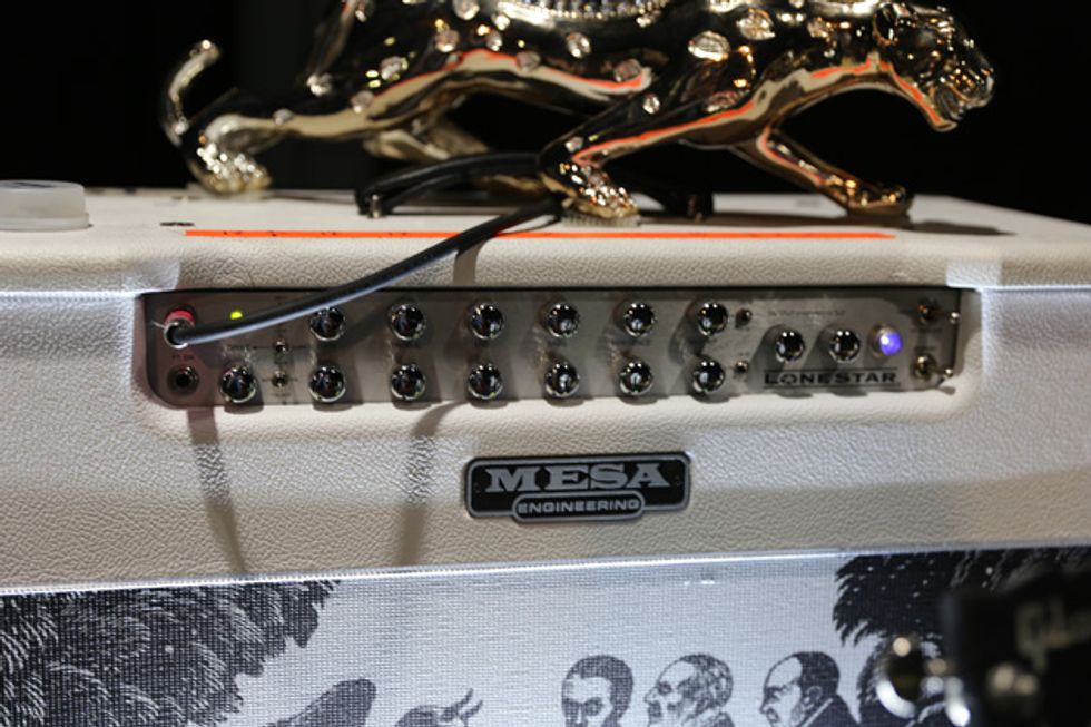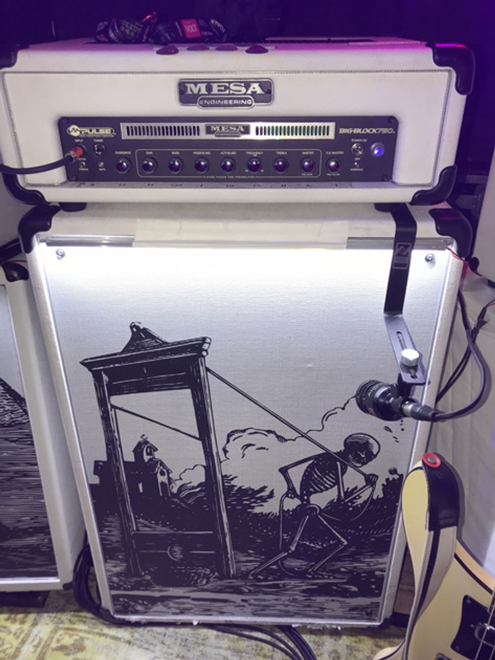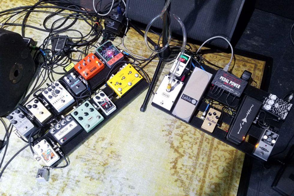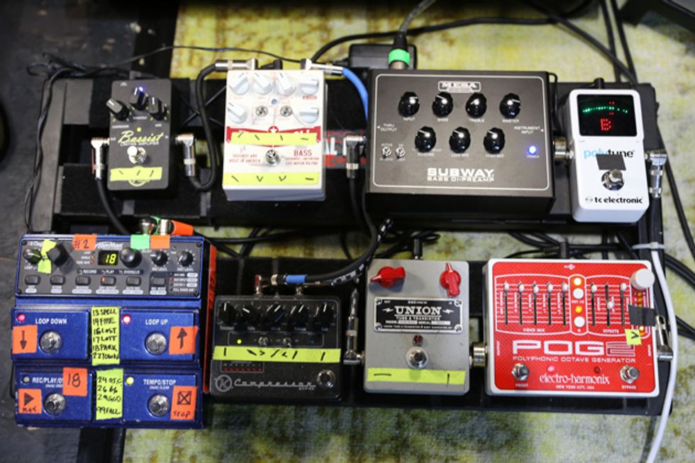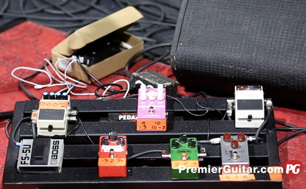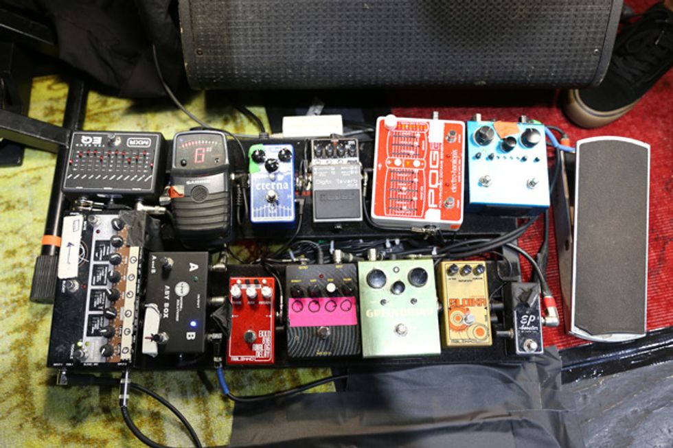 Dulli runs a Shure wireless unit that sends the signal to a Boss TU-3 tuner, MXR GT-OD, J. Rockett Archer, Alexander Pedals Royal Cream (with artwork designed by Greg Dulli), and a Boss DD-7 with tap tempo. These live on a Pedaltrain board and is powered by a Voodoo Lab Pedal Power 2+.