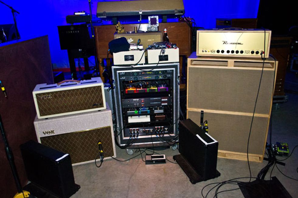In order to keep stage volume at a manageable level, both of Robinson's amps (on the left is a 50th Anniversary Vox AC30HH with matching cab) use Stage Craft baffles. On top of the effects rack is a pair of Fulltone Tube Tape Echoes (one for a short echo and the other for a long echo) and a Fender Vintage Reissue '63 Reverb tank.