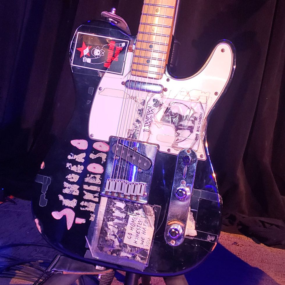 In a 2018 interview with PG, Tom Morello asserted that the single-coil was a big part of his heavy sound: “One of the things that I find, that’s attributed to the ‘heaviness’ of my riffs, is a lot of them are played on a single-coil pickup.” Enter another longtime mainstay of Tom Morello’s—a run-of-the-mill 1982 Fender Telecaster coined “Sendero Luminoso.” He wanted to start writing/performing songs in drop-D tuning, but all of his other guitars at the time had a locking nut, so he traded his roommate for the Tele and Morello had to part ways with a 50-watt Marshall. The Tele is completely stock (aside from the stickers) and to maintain similar string tension to the “Arm the Homeless” he goes with Ernie Ball Regular Slinkys (.010–.046).