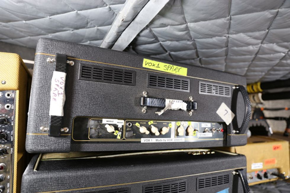 The Edge’s tone comes from combining various vintage and new amps. Under the stage sits Amp Alley, which houses a baffled row of glowing tubes and cranked speakers. Of course, each amp has a spare standing by.