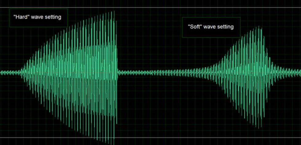 The Wave toggle switch is another very cool feature that allows you to select between a gradual tremolo swell and sharper, choppier wave. The harder setting is certainly angular, though nowhere near as drastic as say a digital square wave tremolo. The softer setting is more like the smoother triangle wave tremolos of the 1950s.