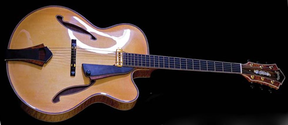 1999 was Grimes’ 25th year of producing archtop instruments. To commemorate the milestone, he designed an archtop guitar that originally was intended to be a limited edition guitar. The design proved to be so popular that he’s still taking orders for this model. Only the most special sets of wood Grimes has acquired over the years are used to construct the 25th Anniversary Model guitars, and they all feature wooden binding and purfling with maple, rosewood, African blackwood, ebony, bloodwood, or curly koa. Available in 16", 16.5", 17", and 18" sizes, the pictured guitar is finished in Light Parchment and is loaded with an optional DeArmond Rhythm Chief 1100 pickup.