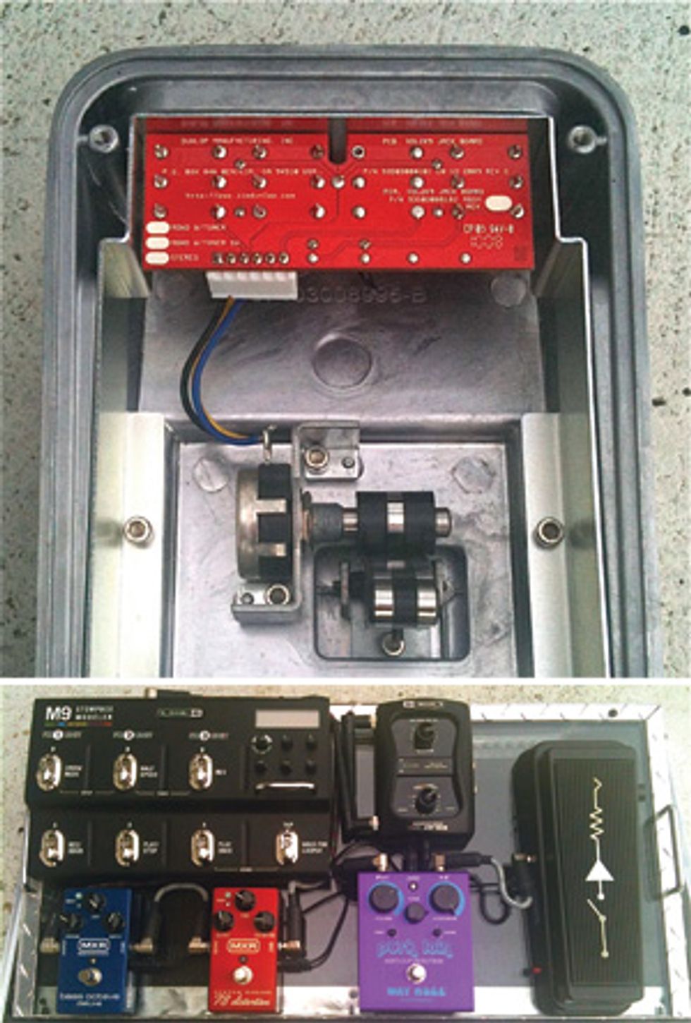 Bottom: Wiring job in progress. A Line 6 M9 stompbox modeler, Line 6 G50 wireless system, MXR Bass Octave Deluxe, MXR Custom Badass ’78 Distortion, Way Huge Pork Loin overdrive, and a Custom Audio Electronics MC404 wah mounted on a Trailer Trash pedalboard. When assembling a pedalboard, the key is to experiment with the arrangement of your stompboxes to optimize the signal flow for your playing style.