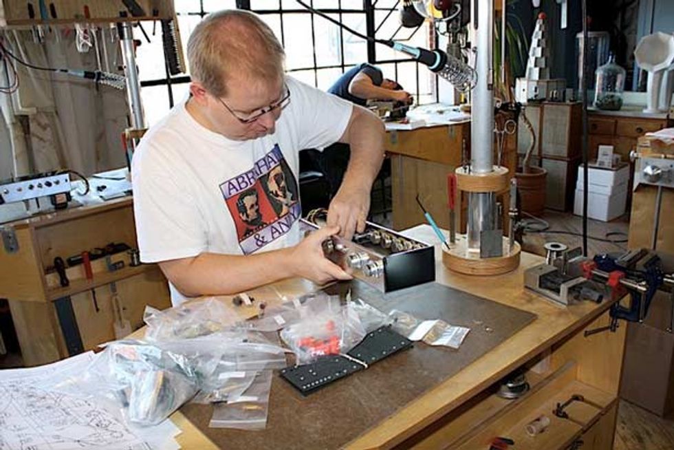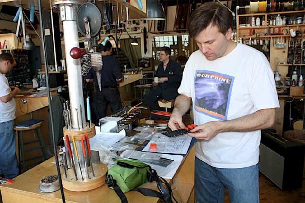 All the courses are taught by Schneller, assisted by Jim Elkington, who’s been with Specimen for ten years. The school offers an ample selection of kits—all provided by Mojo Music—in a variety of flavors from the small Fender- and Marshall-type circuits to big, 100-watters. I settled on building a Tweed Deluxe model, a replica of the original design with the small addition of an artificial center tap on the filaments (to reduce hum and safeguard the power transformer) as well as an upgrade to a 3-prong AC plug. I didn’t already own an amp of that type and thought it would be cool to have one around the PG offices. It's a small, portable amp that promised to be a simple enough build that I’d be able to spend some time during the seminar doing my regular job—taking photographs, shooting video for PG, and talking with the other students.