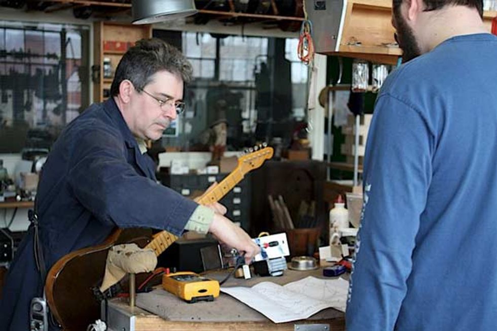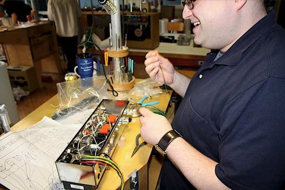 Ian Schneller firing up student Mike Dunn’s Tweed Champ model on the test bench. (Click here to see a video of Mike demonstrating the amp and the mods he added)