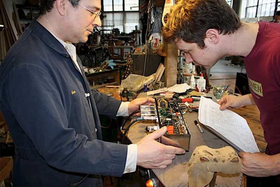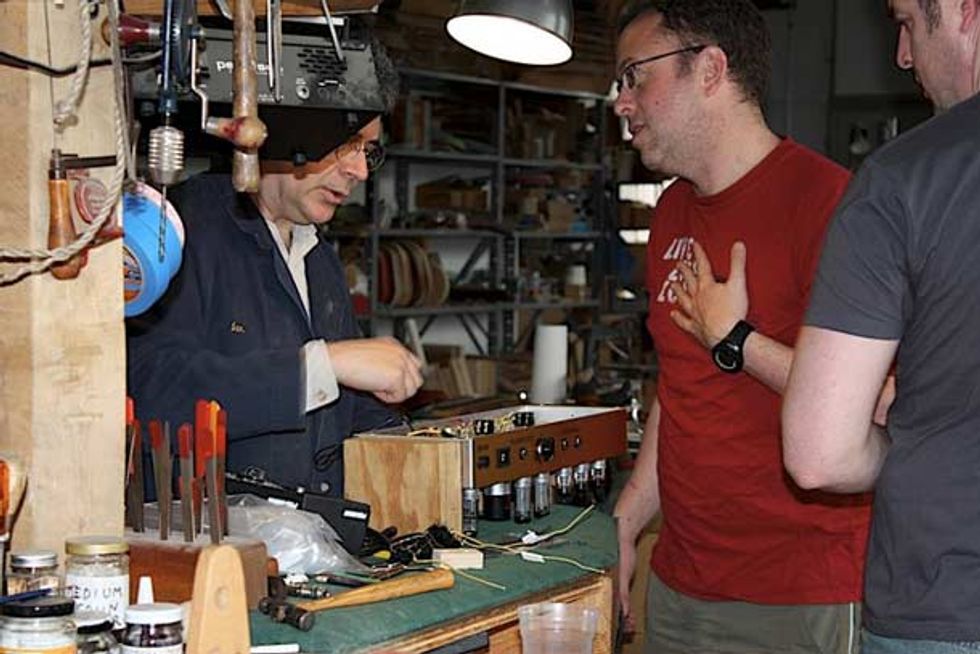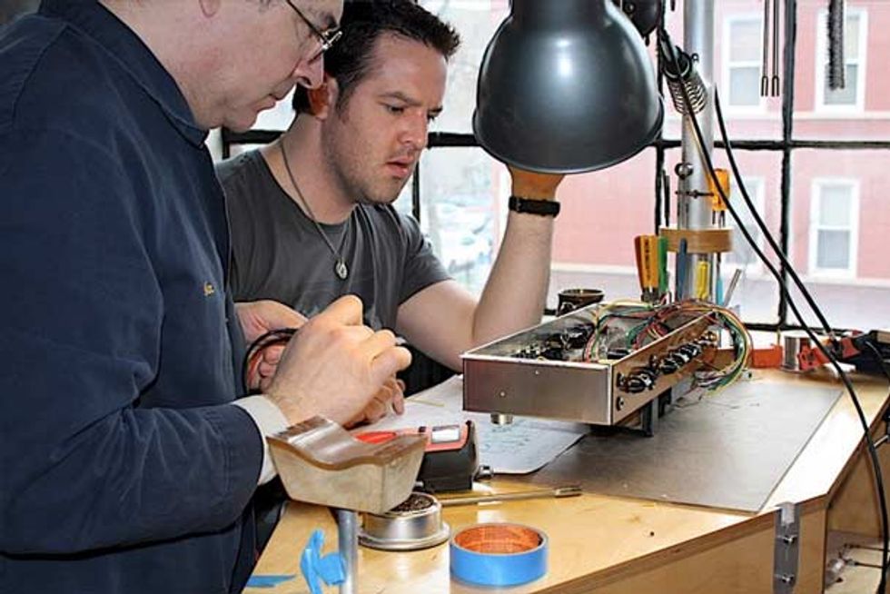 Ian Schneller giving seminar students Adrian Novik and Brendan Casey, both of Chicago, some pointers on their Marshall-style 18-watt amps.