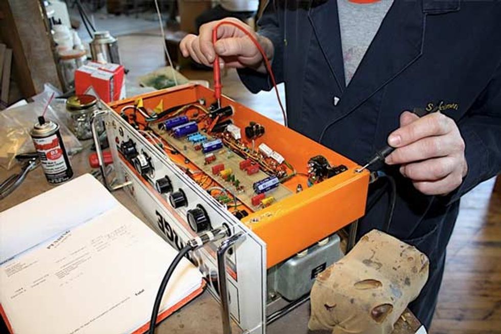 Ian Schneller troubleshooting an Orange amp that came into the Specimen shop for repair. Several non-Specimen specimens like this one served as touchpoints for learning throughout the weekend.