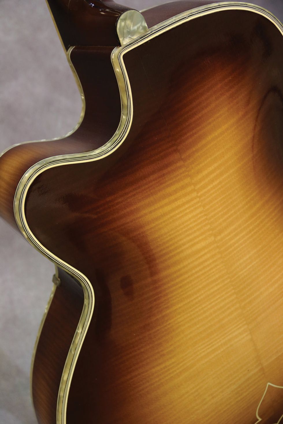 The Committee’s body was listed as having a spruce top and a bird’s-eye maple back and sides in the Hofner catalog, but this one sports a flame-maple back and sides.