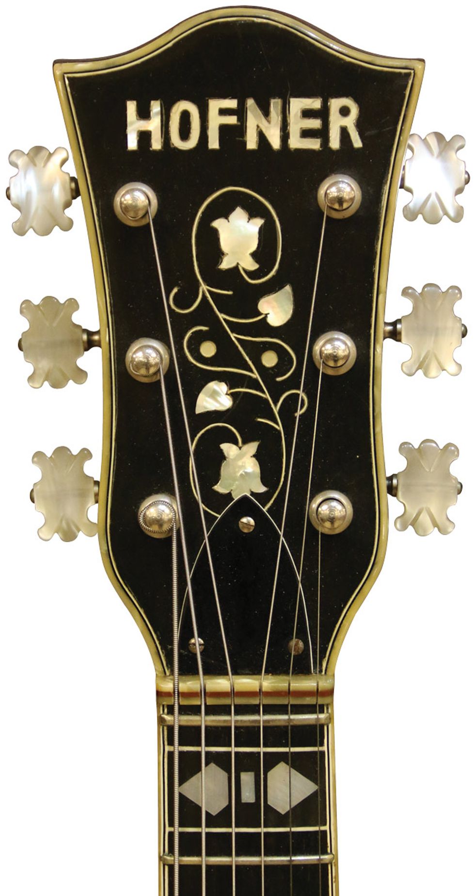 The more ornate “frondose” headstock typically comes on Committees of this era, but this guitar boasts a tulip-style headstock that appeared on other Hofner models.
