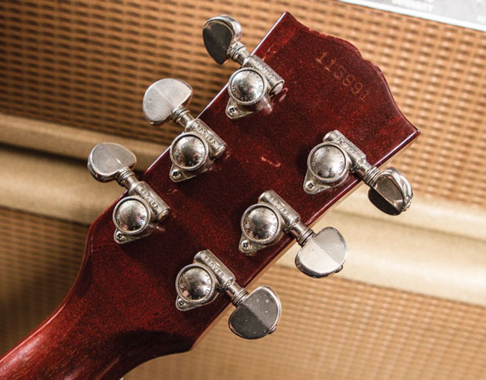 The 1963 ES-335 pictured has many features common to the model that year, including patent number humbucking pickups (the original patent-applied-for pickups were still used arbitrarily until the supply was exhausted in 1964), block inlay markers on a Brazilian rosewood fretboard (these replaced dot markers in 1962), a short 3-ply black pickguard (which replaced the original long pickguard in 1960), and a nickel-plated Tune-o-matic bridge. A stop tailpiece was standard for an ES-335 at the time, but if there was a custom order for one with a Bigsby vibrato, the stop tailpiece holes were covered by a “Custom Made” plaque. Instead of the usual Kluson Deluxe machine heads, this guitar has factory installed Grover Rotomatic tuners. The 1963 list price was $315. The current value for one in excellent all-original condition is $13,500.
