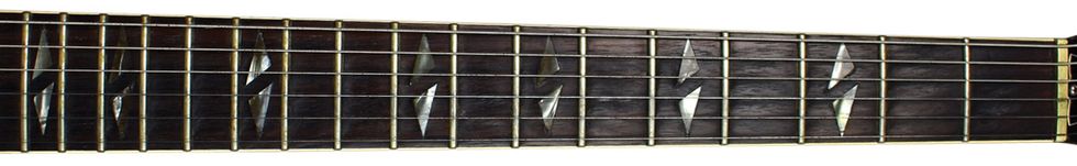 The diamond motif continues up the fretboard, which rests atop a slim-taper mahogany neck. The guitar also has a maple top on its 16"-wide body.