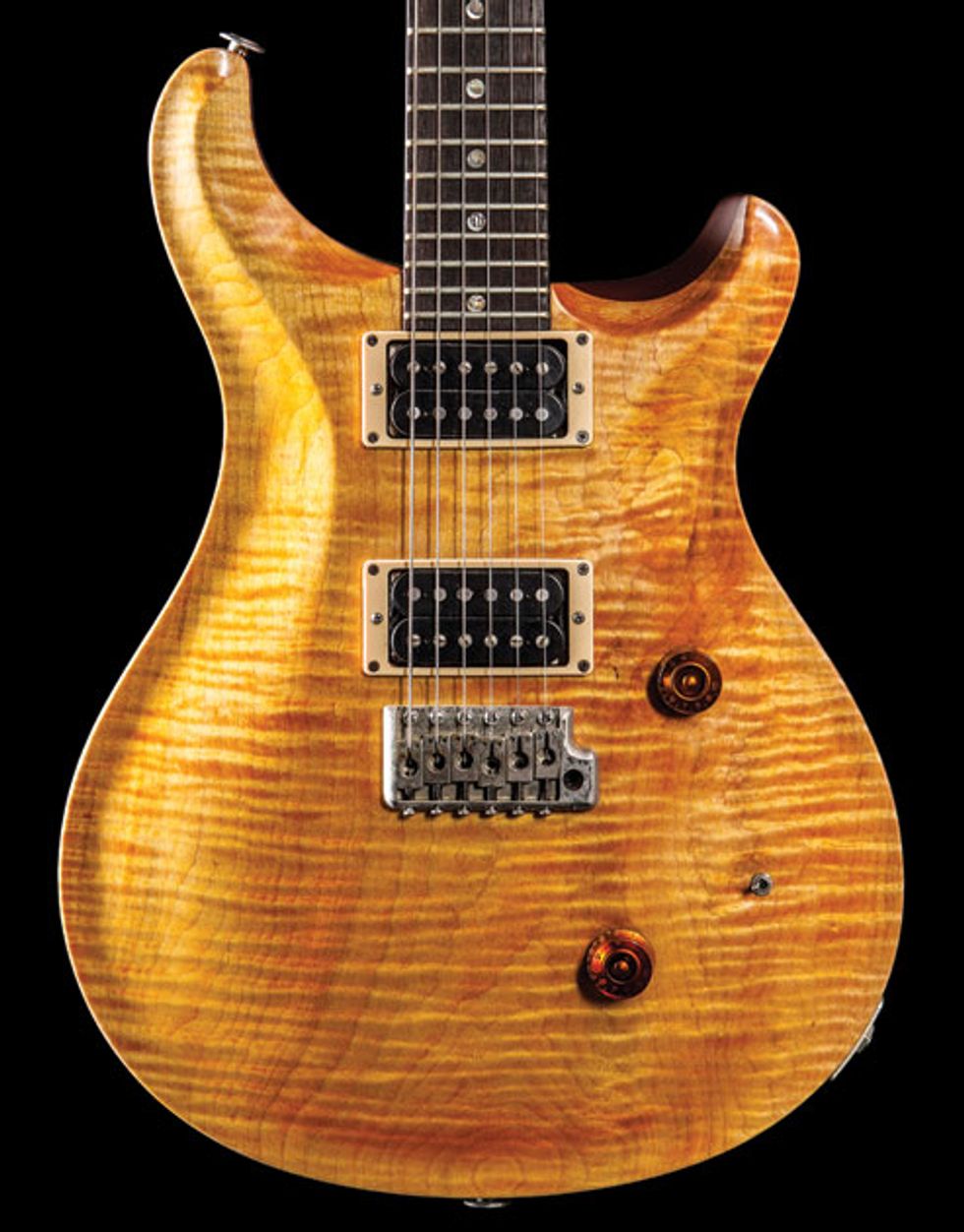 Among this guitar’s charms are a one-piece cherry-stained mahogany body, a maple top with a non-finished natural edge simulating binding, and a Paul Reed Smith tremolo bridge system.