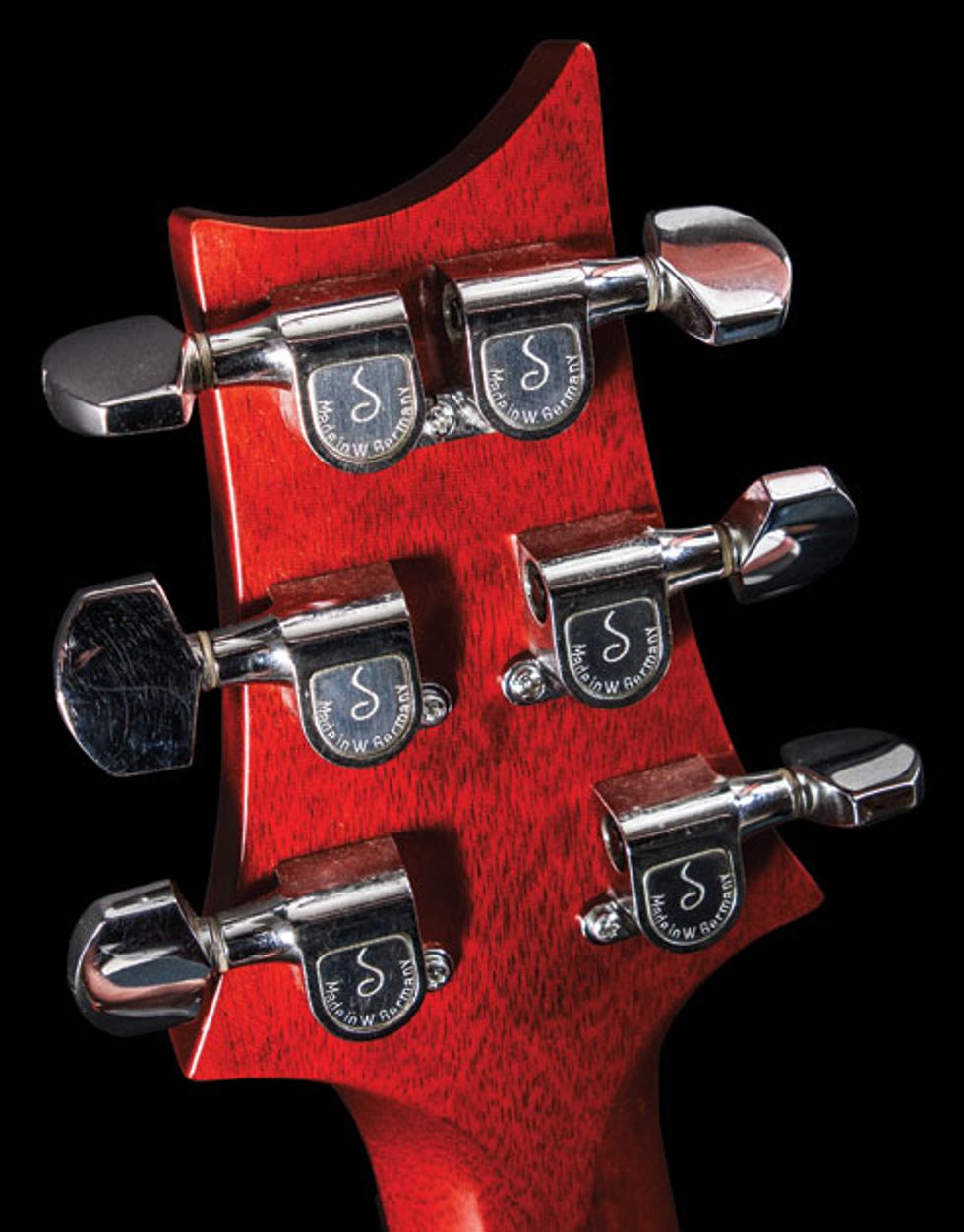 Rare Schaller prototype collars are on the locking tuning pegs atop the classic PRS-shaped headstock of this