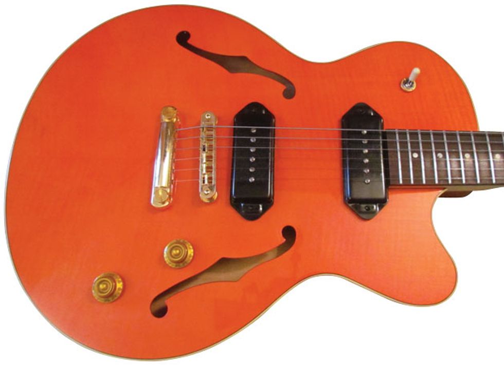 Years ago, when I was first flirting with P-90 equipped guitars, I ran across this beauty on eBay. It was a Yamaha AEX-502 semi-hollowbody with two P-90 pickups. I’ve never owned many Yamahas, but this one really spoke to me with its cool orange color, rounded cutaway, gold hardware, and two F-holes. A real looker, the guitar reminded me of the old ’50s Guild Bluesbirds I’d run across at guitar shows. I bookmarked the auction and kept an eye on it while I did some research.