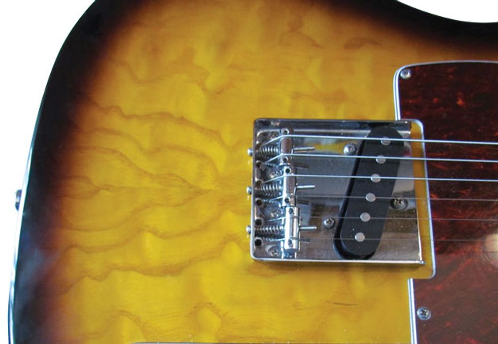 The steel ashtray bridge and old-school 3-way saddles enhance the lead pickup’s nice Tele twang.