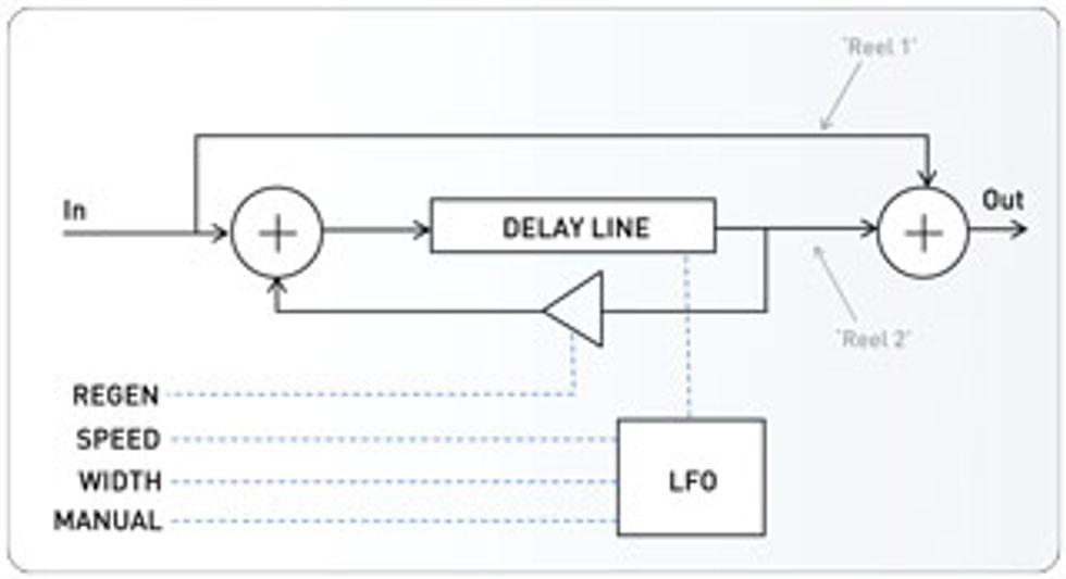 First, a little history. The flanging effect originated from a studio trick involving two synchronized tape reels playing identical source material. The second reel was forced out of sync by applying pressure to the tape-guide “flange,” creating a varying delay relative to the unmolested first reel. When the two signals were combined, it produced a dramatic and chaotic sweeping effect. The introduction of bucket-brigade-delay (BBD) chips in the ’70s opened the door to capture this same effect in a stompbox, with the BBD chip taking the place of the “flanged” tape machine.