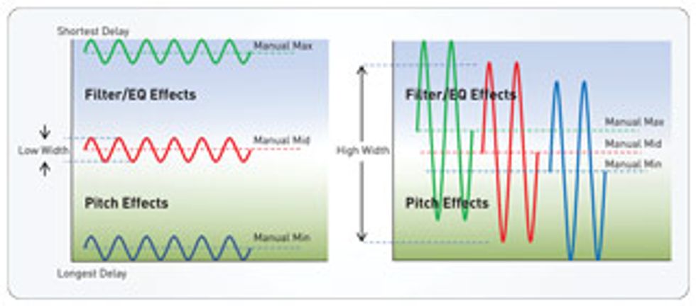 From a technical standpoint, the width knob sets the LFO amplitude, and the manual knob sets the LFO offset. Note that, as the width is increased, the manual control becomes less effective. When the width is at maximum, then the entire region of delay times is being used, so the manual control doesn’t do anything. At the other extreme— with width at zero—there is no oscillation, just a fixed delay time that is adjusted by the manual control, which allows a physical sweep of the entire delay range.