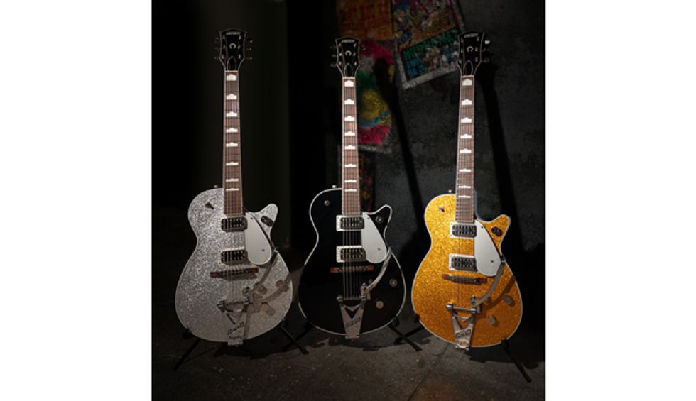 The G6129T-89VS Vintage Select '89 Sparkle Jet with Bigsby comes dressed in Gold Sparkle or Silver Sparkle, while the G6128T-89VS Vintage Select '89 Duo Jet with Bigsby comes in Black. All models feature a silver pickguard, nickel hardware and late-'80s black headstock with Gretsch logo and horseshoe inlay.