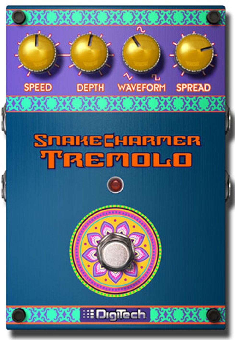 The DigiTech Snake Charmer Tremolo gives guitarists complete control over every aspect of the tremolo effect. The Speed control regulates how slow or fast the tremolo pulsates, from a slow throb to a fast oscillation. Depth controls the degree of the effect, from a subtle modulation to volume completely on and off. Waveform changes the “shape” of the tremolo sound, from a choppy square wave on and off to a smoother pulsating sine wave and many other variations. It can even be turned into a panner using the exclusive Spread knob.