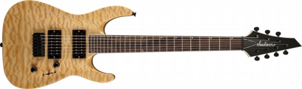 The seven-string B7MG features a beveled alder body, bolt-on quartersawn maple neck with graphite reinforcement and oil finish, compound-radius ebony fingerboard with 24 jumbo frets and side-dot position markers, 27" scale length, direct-mount EMG 707 (neck) and 81-7 (bridge) pickups, Jackson direct-mount HT-7 hard-tail string-through bridge, Jackson-branded Gotoh tuners and Dunlop locking strap pins. The USA Select B7MG Deluxe offers the same specifications as the B7MG, but with a 1-piece neck-thru-body quartersawn maple neck with graphite reinforcement and scarf joint. Both models available in Walnut Stain, Au Natural, Satin Black, and Satin Grey. Models include case.