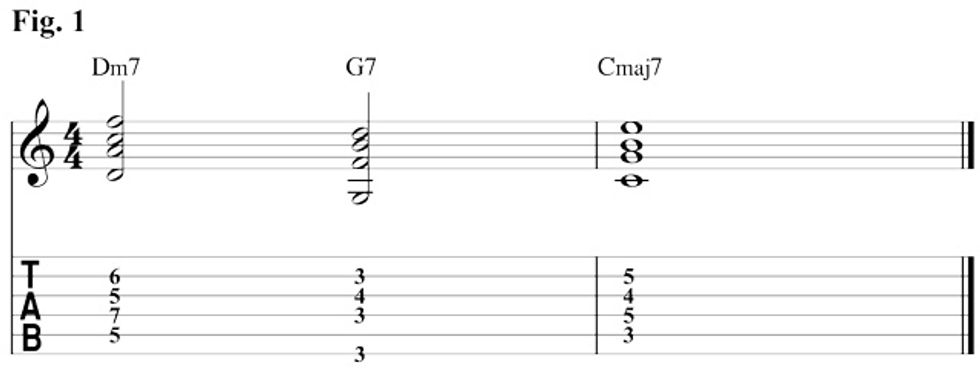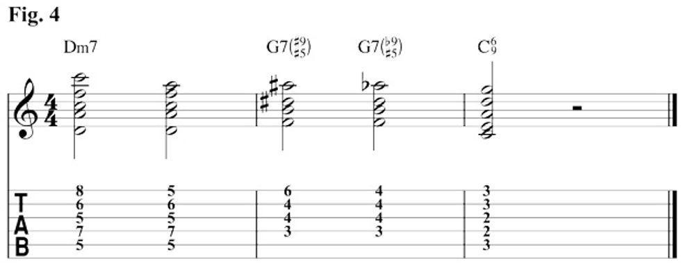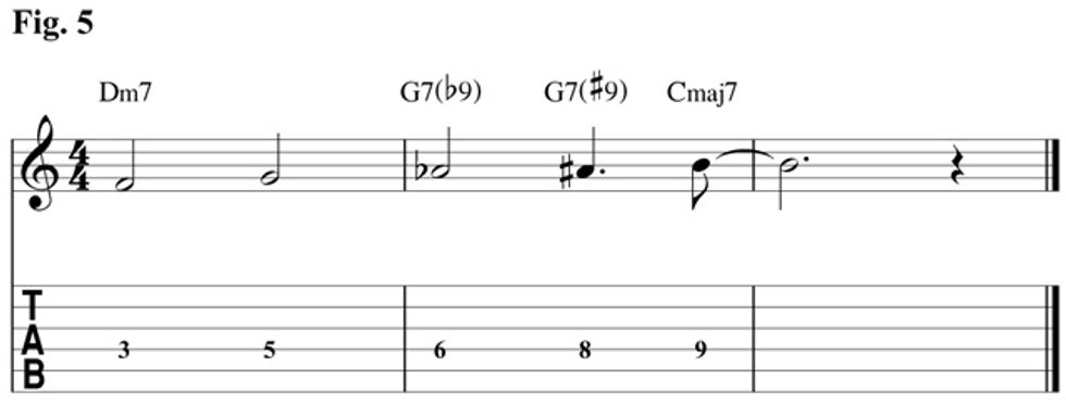 Using these in your basic progressions to enhance what the soloist is playing has limitless possibilities. The example shown in Fig. 4 uses the minor 7 of the ii as the highest voice, leading to the 5, then the #9 to the b9 on the V chord. It’s important to know where the extensions lie on the fretboard. The goal is to have these at your disposal whenever the occasion arises. This also comes in handy when using some single-note comping behind a soloist. This is a technique that brings a subtle, yet powerful form of harmonic support to a soloist. In Fig. 5 you can see an outline of chord tones and extensions that fit the progression we used in the previous examples.