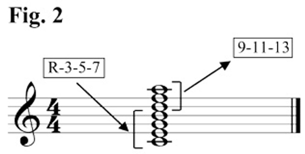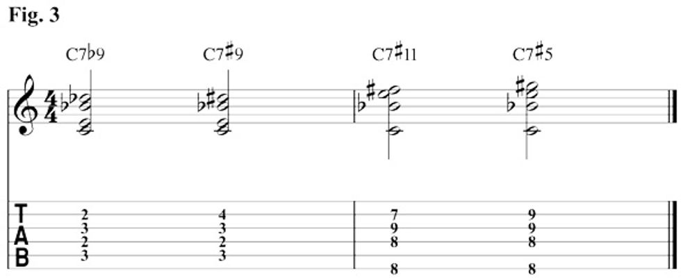 These voicings, although very functional, can be kinda “vanilla” sounding. The next step will be to add some extensions and alterations. In Fig. 2 you can see the basic formula for a major 7th chord plus the extensions (9–11–13) that occur naturally in a key. Certain chords have alterations that we use on the 9, 11, and 13. In the case of a dominant 7th chord, these alterations are b9, #9, #11/b5, and b13/#5. Each chord has its own unique sound and can add a lot of flavor to a solo. In Fig. 3 you can see a few different voicings from some altered C7 chords.