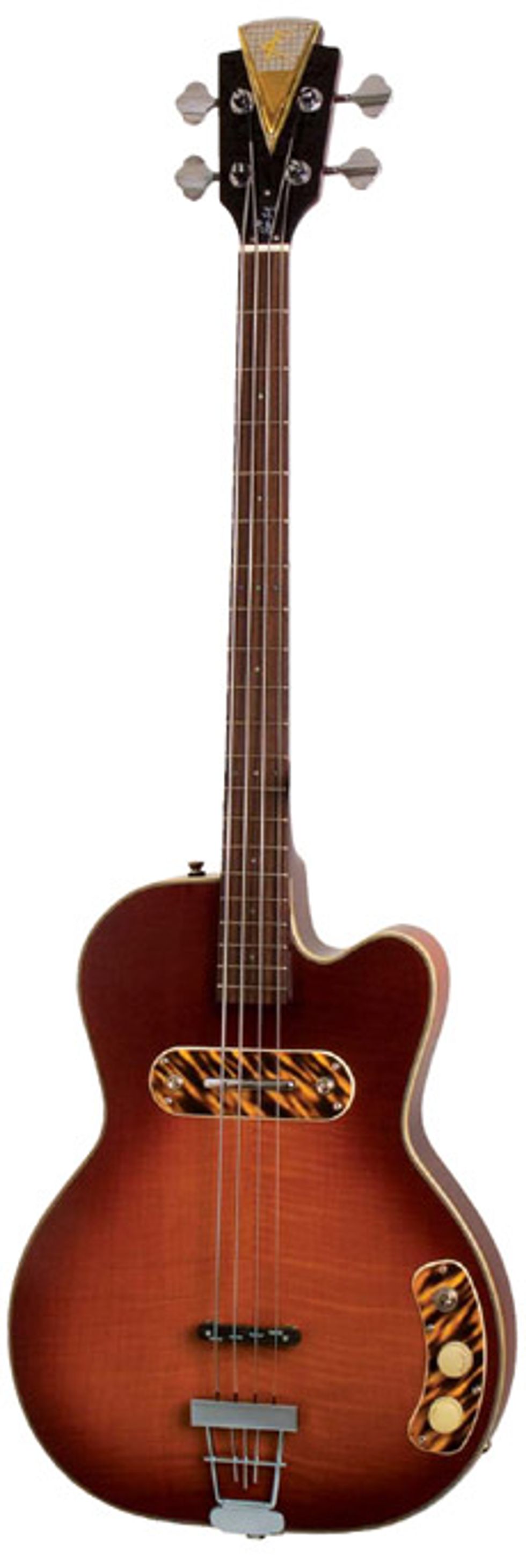 The bass is a recreation of the ones issued in the ‘50s, but with new production also come new, modern upgrades. The new features being introduced are a culmination of 50-plus years of R&D. The bass is a single-cutaway semi-hollowbody with a solid maple top, and with feedback-resisting sound blocks running the length of the body. The biggest upgrade is the addition of a truss rod and an adjustable bridge, which were absent on the original. This allowed Kay to slim the neck to a more streamlined, modern design. (No more 2x4 necks!) The floating tailpiece is as retro-hip as you remember, too. And if you’re looking for the funkiest in throwback features, don’t forget the original Kay “Kelvinator” headstock logo.