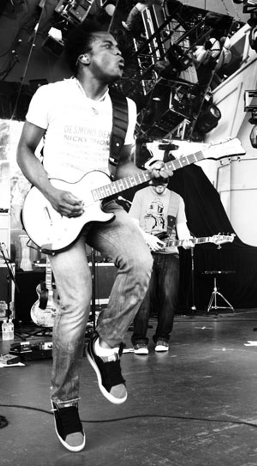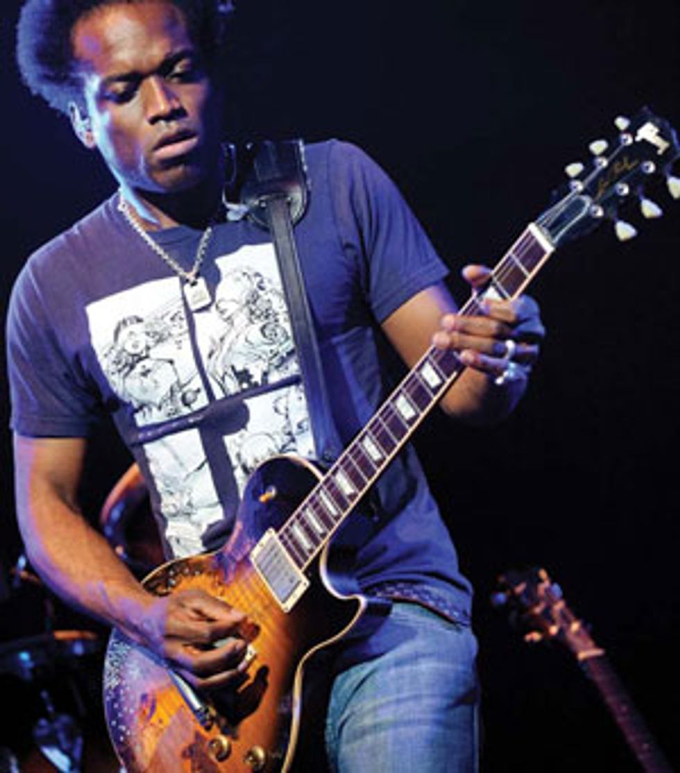 Jennifer MurthaJust as you’d expect from such a diverse band, each member of the Roots has kaleidoscopic musical interests. As a budding preteen guitarist growing up in New York, Douglas was simultaneously influenced by funk forefathers like James Brown and rock icons like Kiss and Van Halen. The self-professed Led Zeppelin devotee rocks a prototype of a Jimmy Page signature Les Paul—same relic’ing and all. Douglas performed with the Dave Matthews Band prior to joining the Roots permanently in 2002. Apart from the Roots, he plays in a very different vein with his side project, Hundred Watt Heart.
