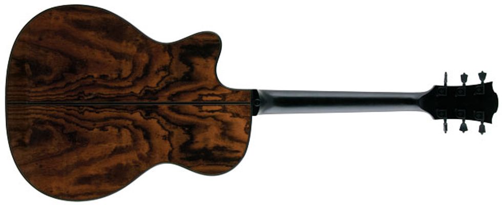 It’s an interesting-looking guitar. A sculptural headstock and a fretboard devoid of position inlays suggest a modern high-end jazz guitar. The unconventional snakewood rosette flares at the bottom to include the image of a Mesoamerican deity. All-black hardware and an opaque black neck finish add to the clean, modern look. But as bold as these design moves are, the deeply figured snakewood is even more striking.