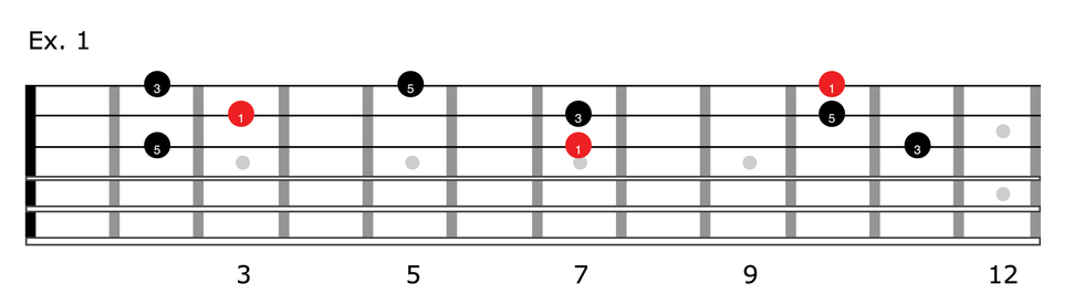 What’s the difference between a major and minor triad? Simply moving one note–the major third–down a single fret. In our examples, we will be moving the F# to F natural. In Ex. 3 you can see how this changes the shapes on the top three strings.