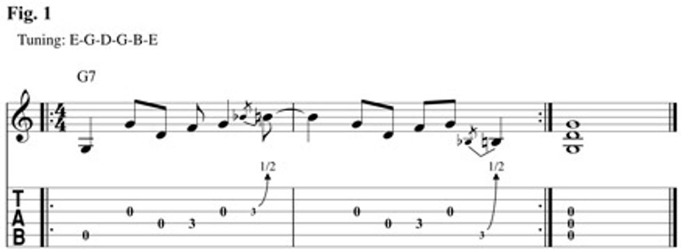 The lick in Fig. 1 uses a neat tuning trick I picked up from ZZ Top’s “Jesus Just Left Chicago.” We’re in the key of G, which is a great key for open strings because the 2nd, 3rd, and 4th strings are a G chord. Note: To get a full low G that has some ring to it, I’ve lowered the 5th string down to G. This makes this lick a breeze to play and emphasizes all those open strings. Dropped-G tuning offers some of the benefits of full open G tuning, yet soloing is much easier because your top four strings stay in standard tuning.