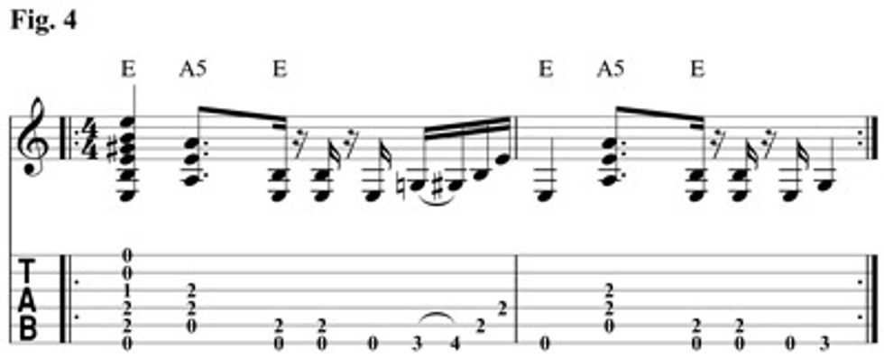 I am such a sucker for the shuffle feel in Fig. 4—not to mention the sound of those big ringing open chords combined with a little bluesy riff. This one plays up that great sound of mixing the scale’s lowered 3 and natural 3. An important element to getting this to sound right is not to play too softly. Really smack the crap out of the strings. Also, don’t gain out your amp too much— you want to keep the clarity of the chords.