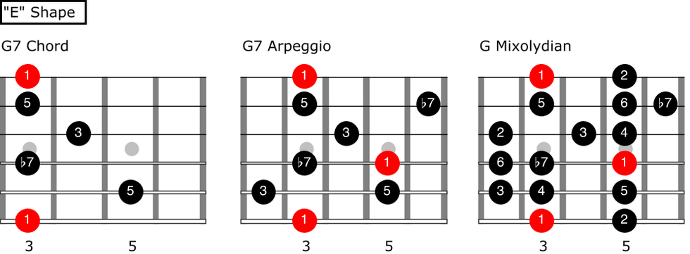 Now if we transfer this arpeggio-scale relationship to other shapes of the CAGED system, you might find yourself in the “E” shape, which would look like this: