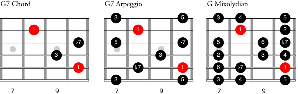 As you can see above, we’ve got three things to learn, but really they’re all very similar since the arpeggio contains the chord and the scale contains the arpeggio—that’s very important. Your goal is to be able to see the chord right away and instantly fill in the arpeggio and the scale around it.