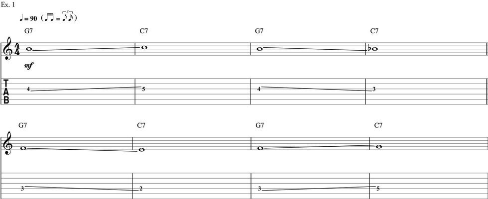 Ex. 2 is a fleshed-out version of something you might hear from a bass player pushing towards the IV chord. As a bass line, you might hear the G walking up to the C by way of an A, then a passing note of Bb, and then a B before landing on C on beat 1. This melodic line sits on top of the G7–Cm6/G–Bbdim7–G7 while the bottom voice pedals a G. This gives a nice sense of movement on the top voices while the lower voice ties it together with the held G. We resolve to the root of the C7 in measure 2 before resuming our blues vocabulary over the IV chord.