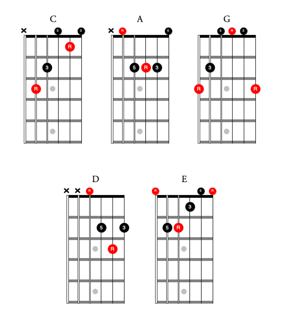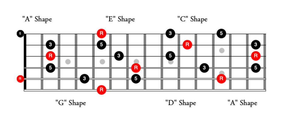 In Fig. 2, you'll find the five CAGED chords with the location of the root, 3, and 5 labeled in each chord diagram. To help you get visually oriented within each shape, the roots are marked in red. You'll notice that each shape contains more than one root. C, A, and D each have a low and high root; G and E each have three roots—low, middle, and high.