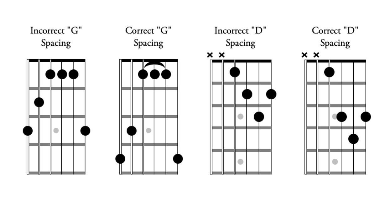 Two shapes that are less familiar and prone to spacing errors are the "G" and "D" shapes, and the common spacing error is to compress the fingering. Be sure to keep an empty fret between your first finger and the remaining fingers used to build the chord. Fig. 4 contrasts the incorrect, compressed fingerings with the correct ones for these two shapes.
