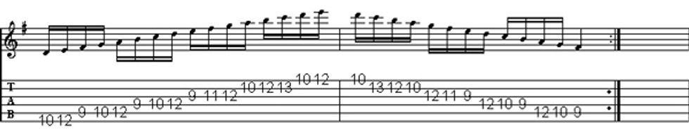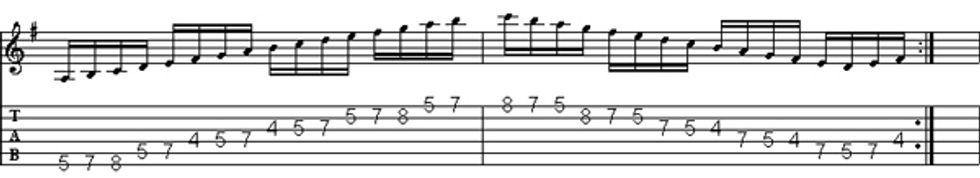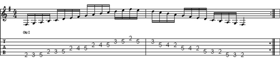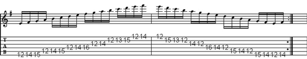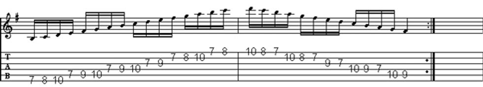 Now I’ll illustrate different forms of the Locrian scale for you. In each example I’ll stop on the root of the scale, and I encourage you to do the same as this will give your ear a better understanding of the mode and help you to gain depth in your aural comprehension of Locrian. After you’ve completed the 5th form of the scale you’ll be exactly one octave higher from where you started with the first form of the scale. You should notice that the five forms repeat at the octave!
