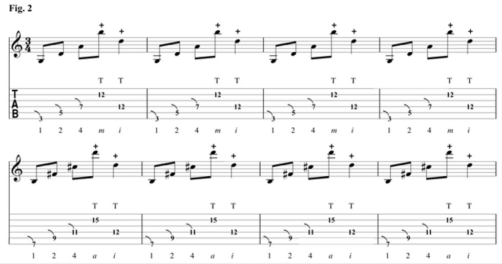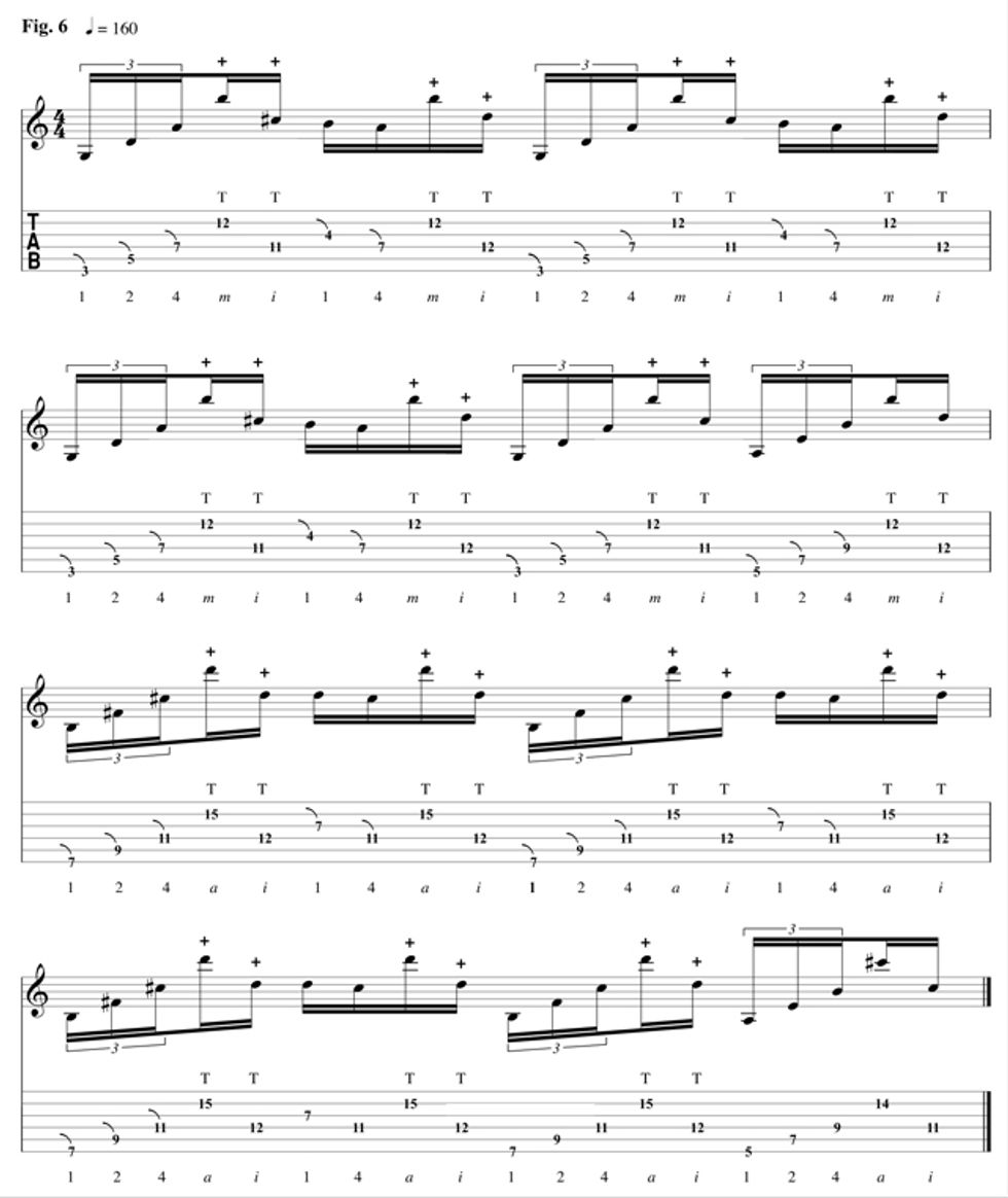Since this is an advanced technique, we need to illustrate both hands in the musical examples. When you see a number below the tab, it refers to your fretting-hand fingers. The italicized lowercase letters follow the traditional classical guitar notation to indicate specific fingers on what would usually be your picking hand, but is now your tapping hand: p, i, m, and a—or thumb, index, middle, and ring, respectively.The first example (Fig. 1) is the starting point for mastering the entire lesson. Most of the left hand (fretting hand) will focus around add 9 arpeggio shape hammer-ons, and will be the main movement you’ll really want to have nailed down before moving on. Most guitar players struggle to hammer-on any note with their pinky, just dedicate some time to practicing and you’ll be able to get it down. When practicing this example, make sure that when you strike each note with either your left hand or right hand (tapping hand), you’re on the tips of the fingertips. This approach will help with overall volume for each note. For this example, you’ll be tapping with your right-hand middle and index fingers.