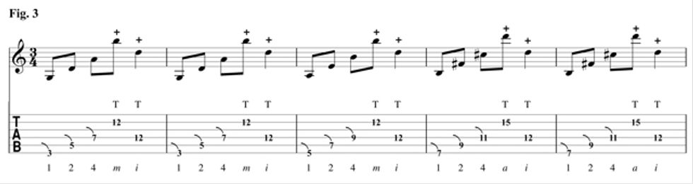 In Fig. 2, we’ll be incorporating a change of arpeggio shapes for the left hand and introducing the octave tapping shape for the right hand. This one will start out similarly to the first example, but move up from the first shape two whole-steps to B (7th fret), hammering the same shape, but now tapping a D octave shape.