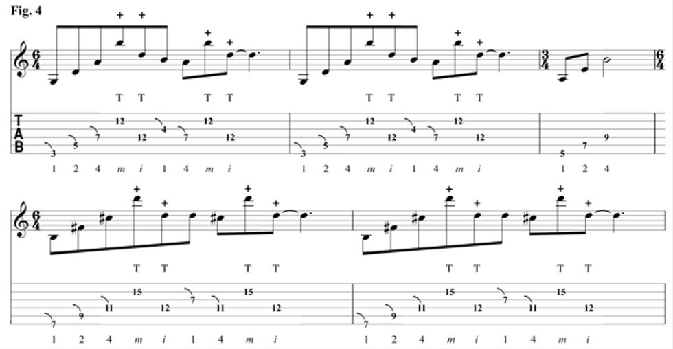 For this final example (Fig. 6), we’ll combine everything we’ve done in the previous examples to form a complete riff. This tapping riff is the intro to our song “Atlas Novus," from our newest album The Migration.
