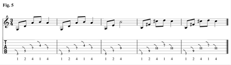 Fig. 4 incorporates two more notes into the arpeggio shape while doubling the tapping notes from all of the previous examples. For the first arpeggio shape, we’ll add a B (4th fret on the 3rd string) and another 9, A, on the 4th string. For the second arpeggio shape, the A shape, we won’t be adding anything. For the third arpeggio shape, the B shape, we’ll add a D (7th fret on the 3rd string) and another C# (11th fret on the 4th string).