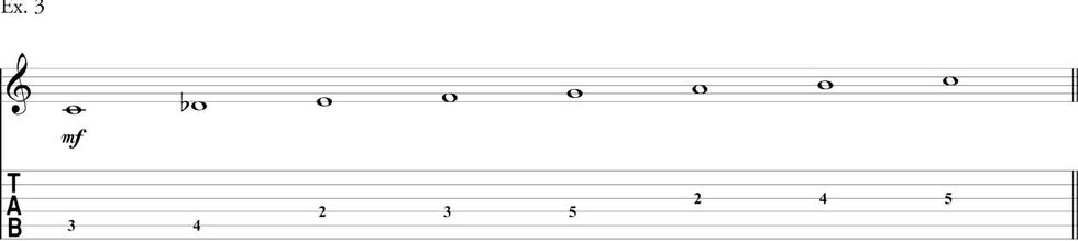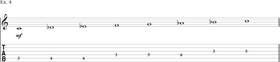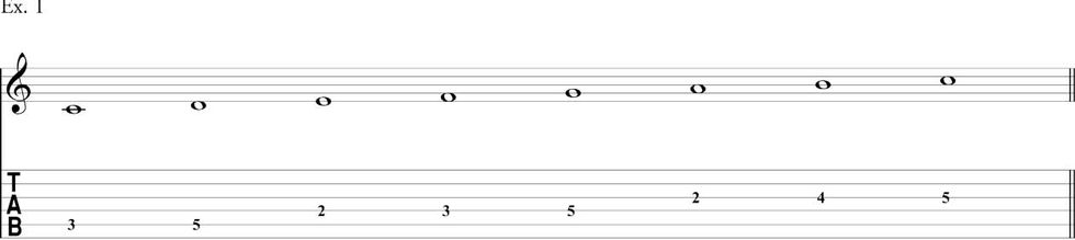 You probably know that the major and minor scales each have seven notes. There’s a whole-step (two-fret) gap between most of the scale steps. In major scales, half-steps fall between the third and fourth scale degrees and between the seventh and octave (a return to the first scale note, but eight scale steps above), as in Ex. 1.